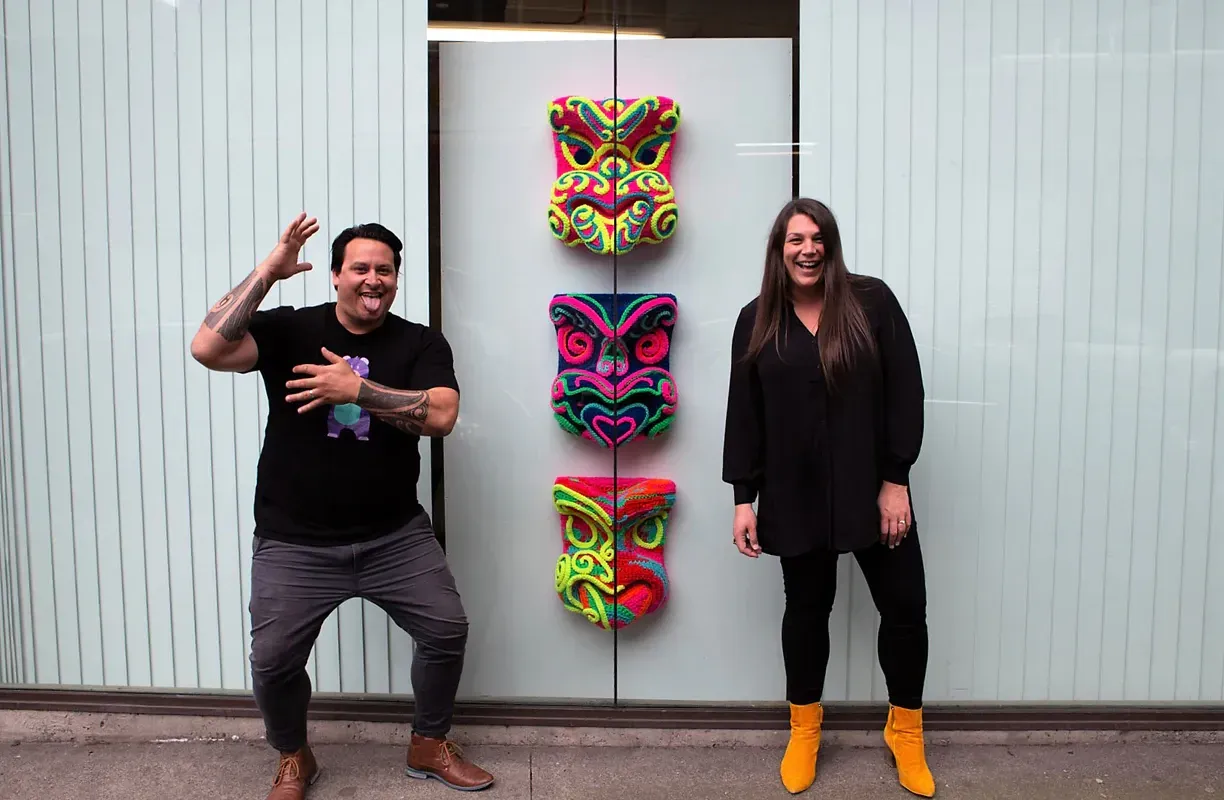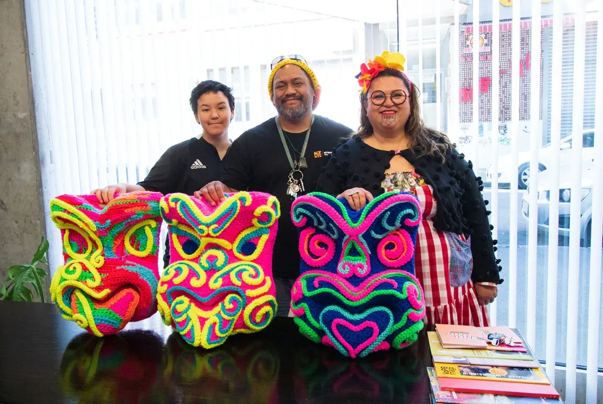 Our art is a way in which we connect to our Tūpuna our present and our future. Our kaupapa is simply joy expressed through crocheted bright bold colours and forms. The colours have real energy and respond well to the vibrancy and legacy of Karangahape Road. We hope our wheku bring joy and uplifts everyone who encounters them!"