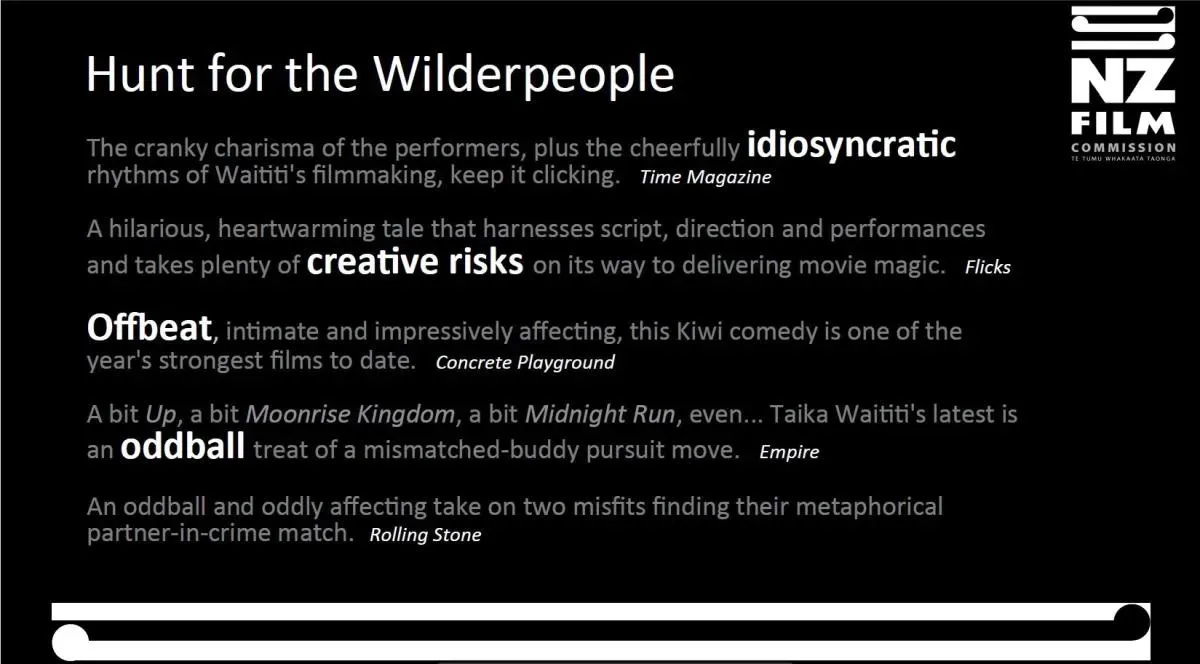 2. Because the film industry thrives on fresh talent and ideas. And, as I will discuss shortly, films that are outside the norm and are fresh and risky are more likely to be successful coming from a small country like New Zealand.