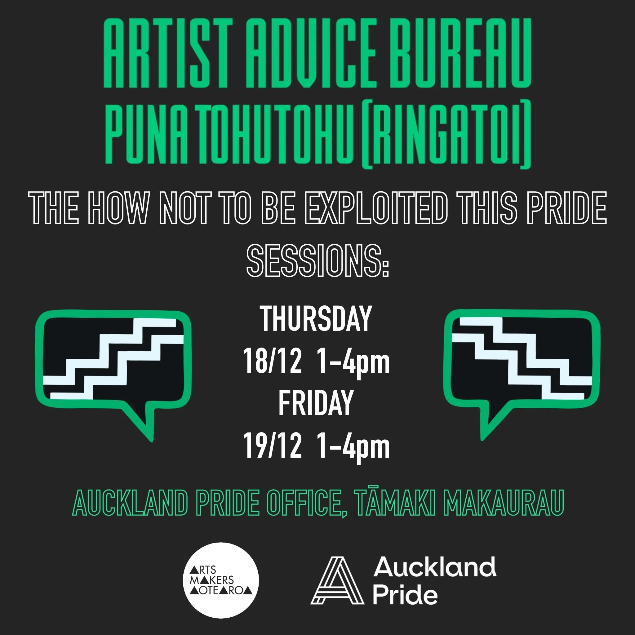 We’ve got you! As part of an Art Makers Aotearoa x Auckland Pride collaboration, we are running - the Artist Advice Bureau / Puna Tohutohu (Ringatoi) ‘How to not be exploited this Pride’ sessions.