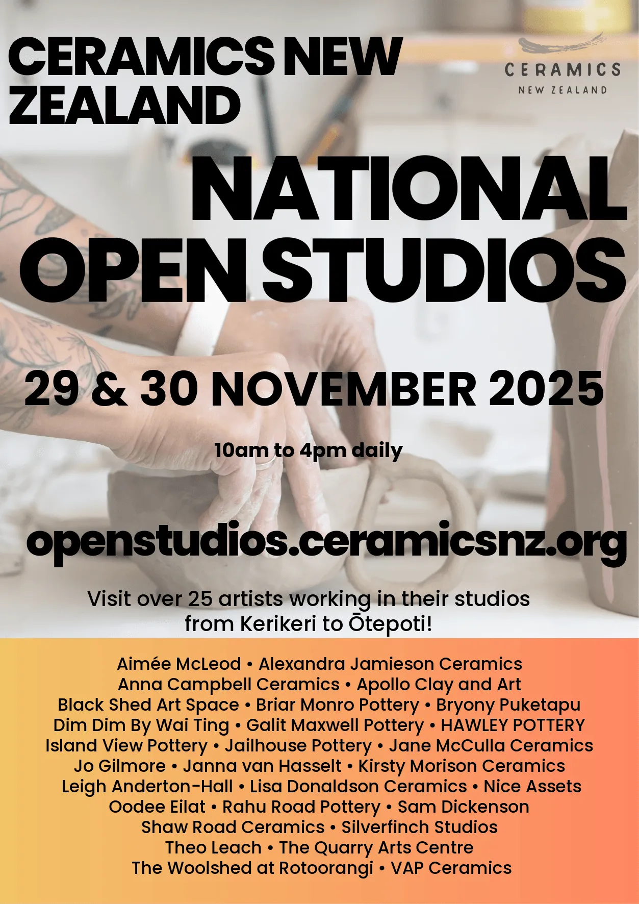 Ceramics NZ National Open Studios is an annual, nationwide, weekend event that celebrates clay, community and creativity. Hosted by The Ceramics Association of New Zealand, ceramics studios around Aotearoa open their doors to offer a peek into their making, practical demonstrations and the chance to take home a handmade piece.