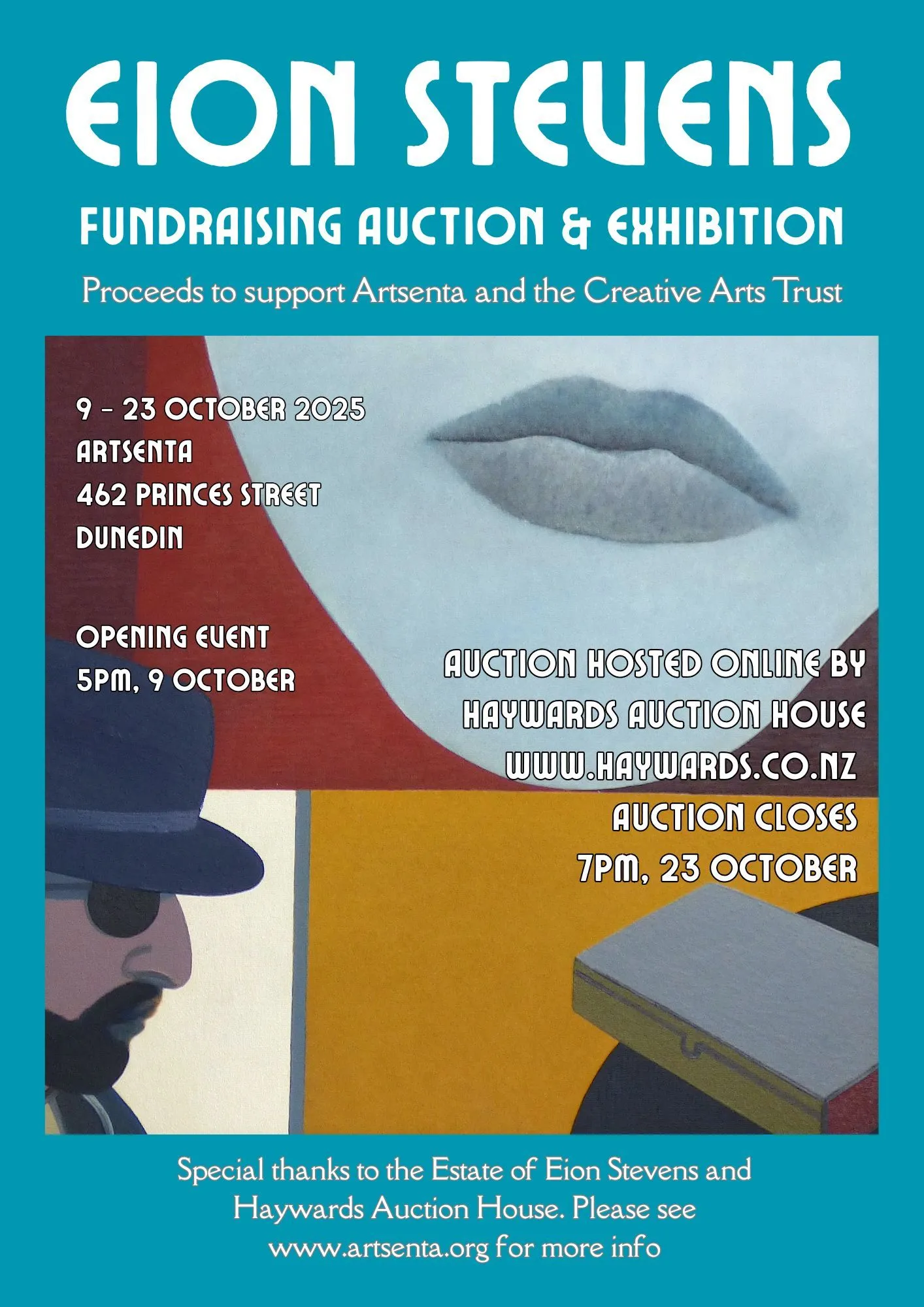 An exhibition of artworks will be available for viewing at Artsenta from 10-23 October. The online auction will be hosted by Haywards Auction House and will begin at 5pm on 9 October in conjunction with the official opening of the exhibition at Artsenta. The Exhibition and Auction ends on 23 October.