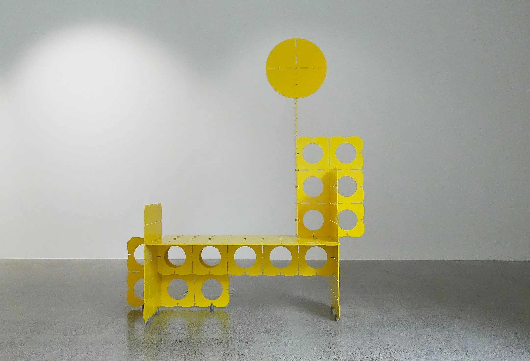 The smooth surfaces, slots, and curves of these structures resemble furniture or stage props, they hint at utility without ever fully offering it. This ambiguity is deliberate: the works sit just outside of use, creating a kind of sculptural theatre where the viewer is cast as both audience and participant.