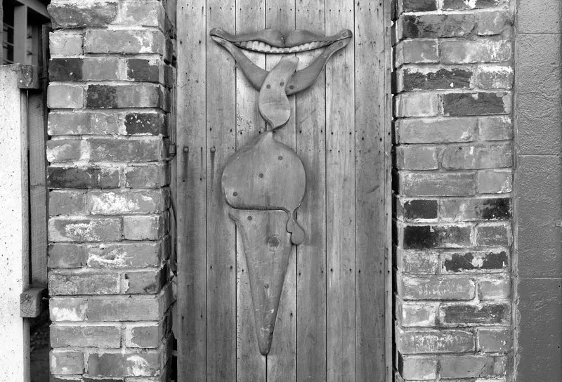 Poster image | Loud Think c.1979, Laurence Aberhart, scanned original silver gelatine negative (photograph of door at Noko’s restaurant in Lyttelton carved by Bill Hammond)