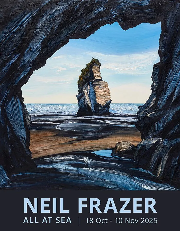 Frazer fills his canvases with the immersive grandeur of the ocean and the rugged forms of our coasts. His images display the stacks and cliffs of the northwestern South Island, including some landforms which he has repeatedly returned to during his career. The elephantine forms of the weathered islets of Great Divide and Blue Arch are particular favourites, which have recurred frequently.