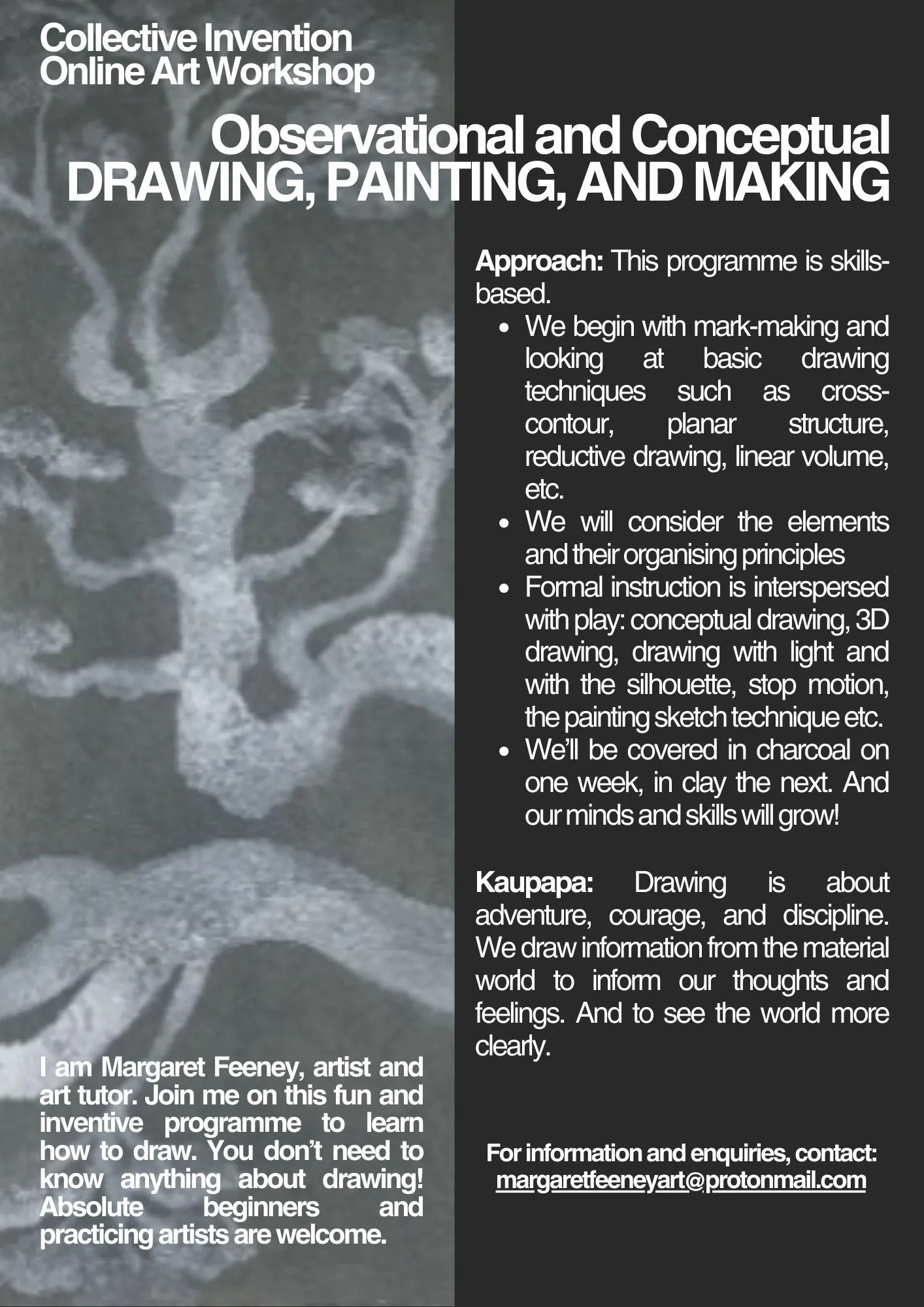 I am Margaret Feeney, artist and art tutor and welcome absolute beginners and practicing artists to this programme. You don’t need to know anything about art or drawing! Come along and learn how to draw information from the material world to inform your thoughts and feelings. And to see the world more clearly.