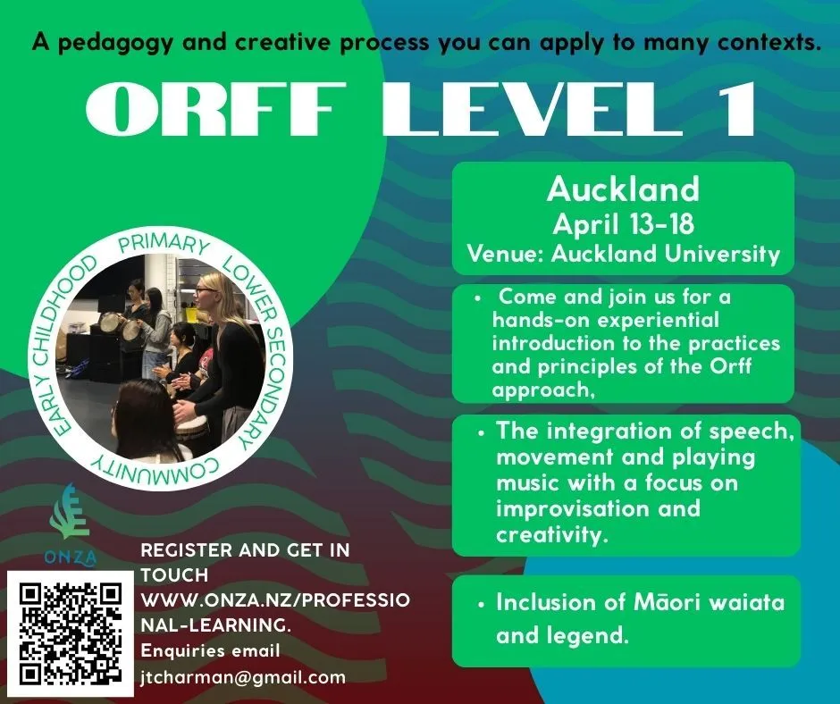 Come and join us for a 6 day course in music. Speech, singing, movement, and instrumental work that introduces you to the processes and principles of the Orff approach to music education. Hands on, collaborative, creative, and exploration of New Zealand material with a focus on improvisation.