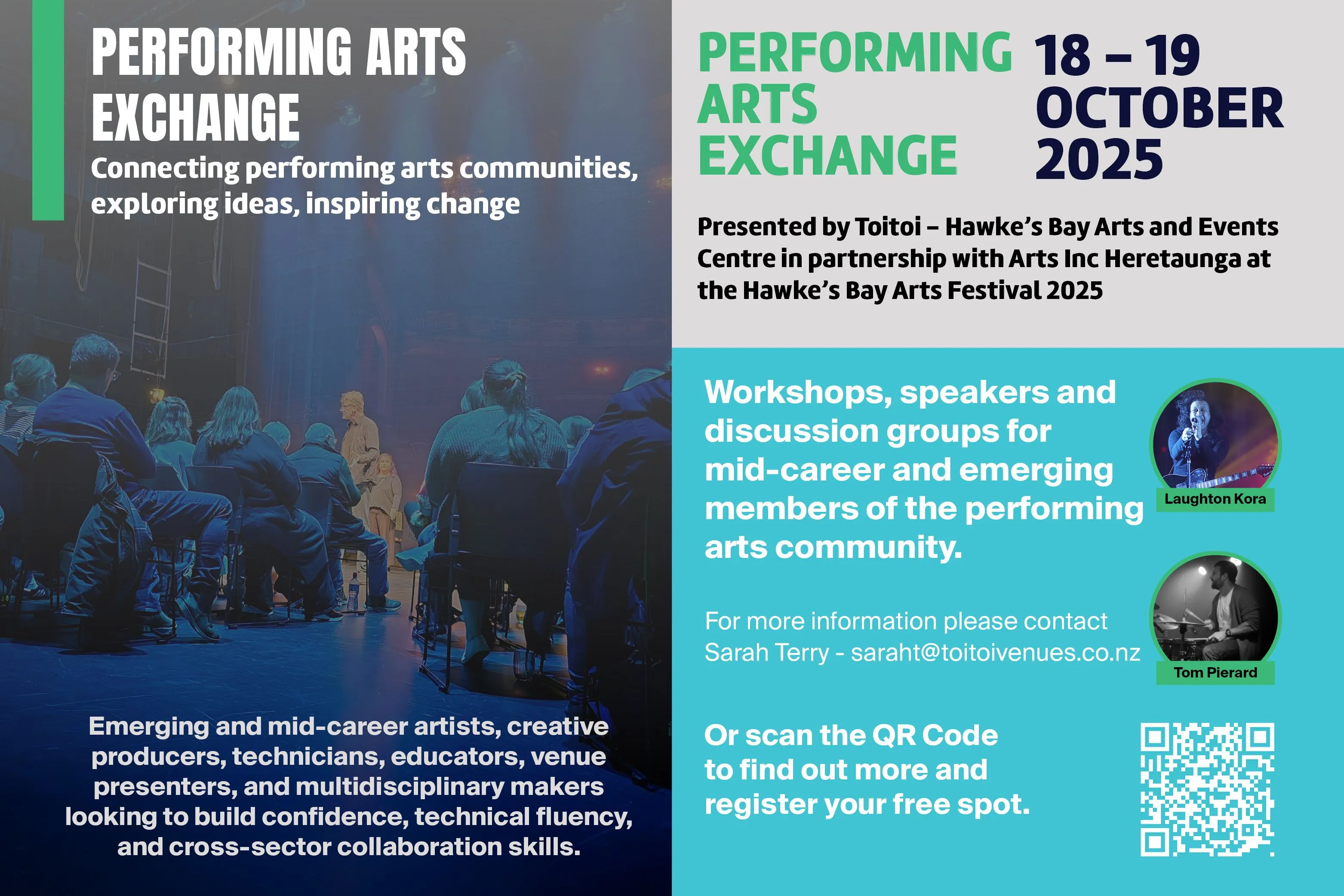 Presented in partnership by Arts Inc Heretaunga and Toitoi - Hawke's Bay Arts and Events Centre.