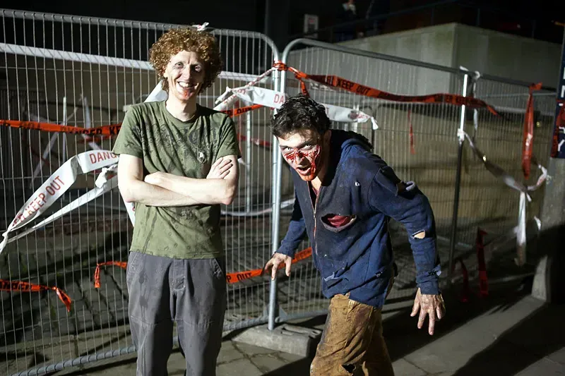“…instead of in a foyer or reception we had the audience waiting outside in the car park? And instead of being nicely heralded in by ushers waving programmes they were suddenly chased by zombies? Then we bust open a roller door we get them inside and then….”