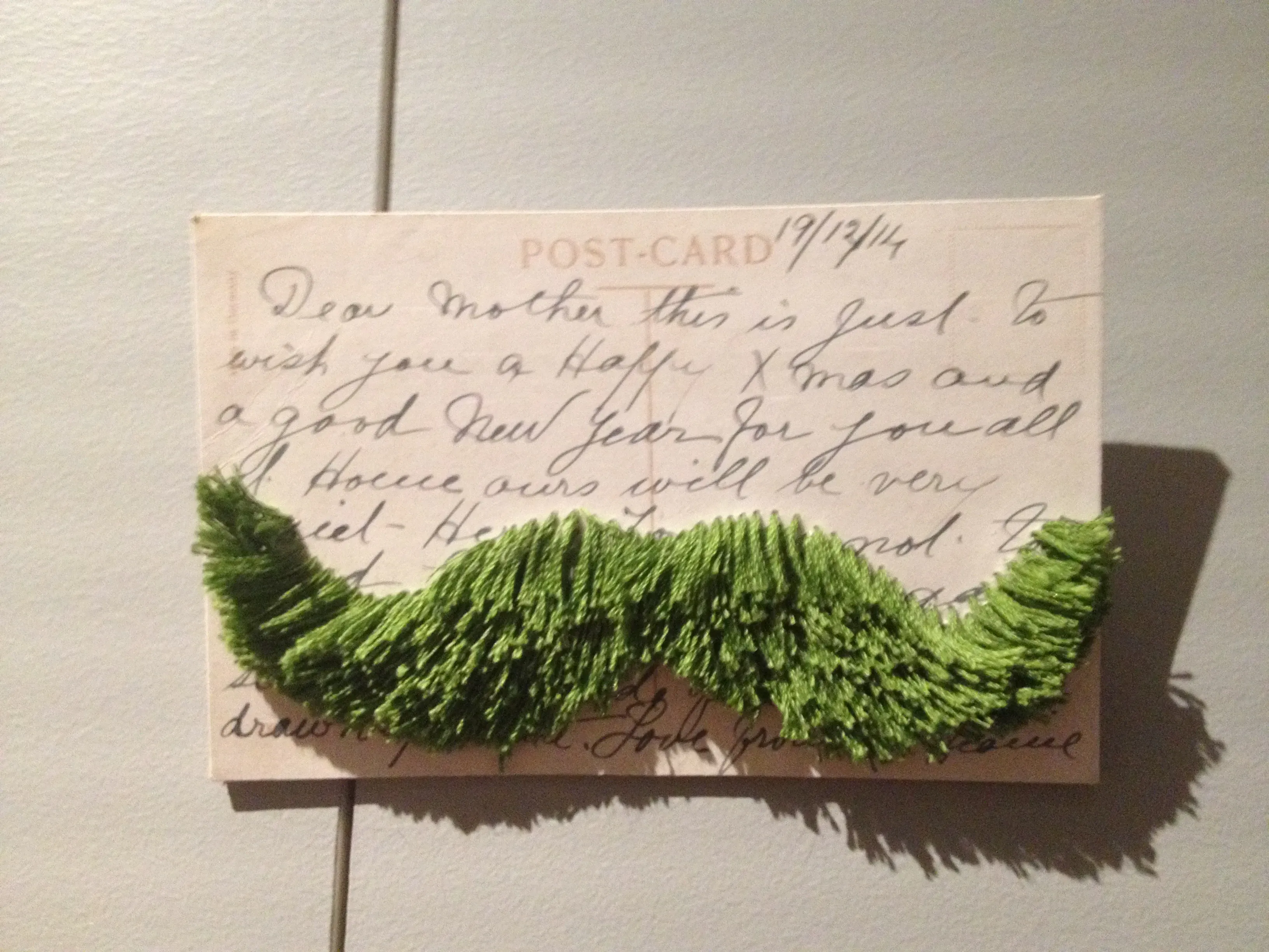 A range of the artists table ceramic works meditate in wonky hilarious fashion on the commemorabilia one might want from ones teenage-hood in 1986 – a cassette tape, plates celebrating the ‘Princess of the People’ and Hayley’s comet. Other works celebrate the cultural history of Whanganui – a composer bust of former resident composer Douglas Lilburn for example. On the wall nearby Hurley produces a Victoriana fabric moustache for each of the 66 days he spent at the old cottage, mounted on the back of old postcards, the messages intact. For me it paid homage to the way this town keeps such physical ephemera of the past and its stories alive in the present. It’s as if the ever-flowing river forever keeps history fresh here.