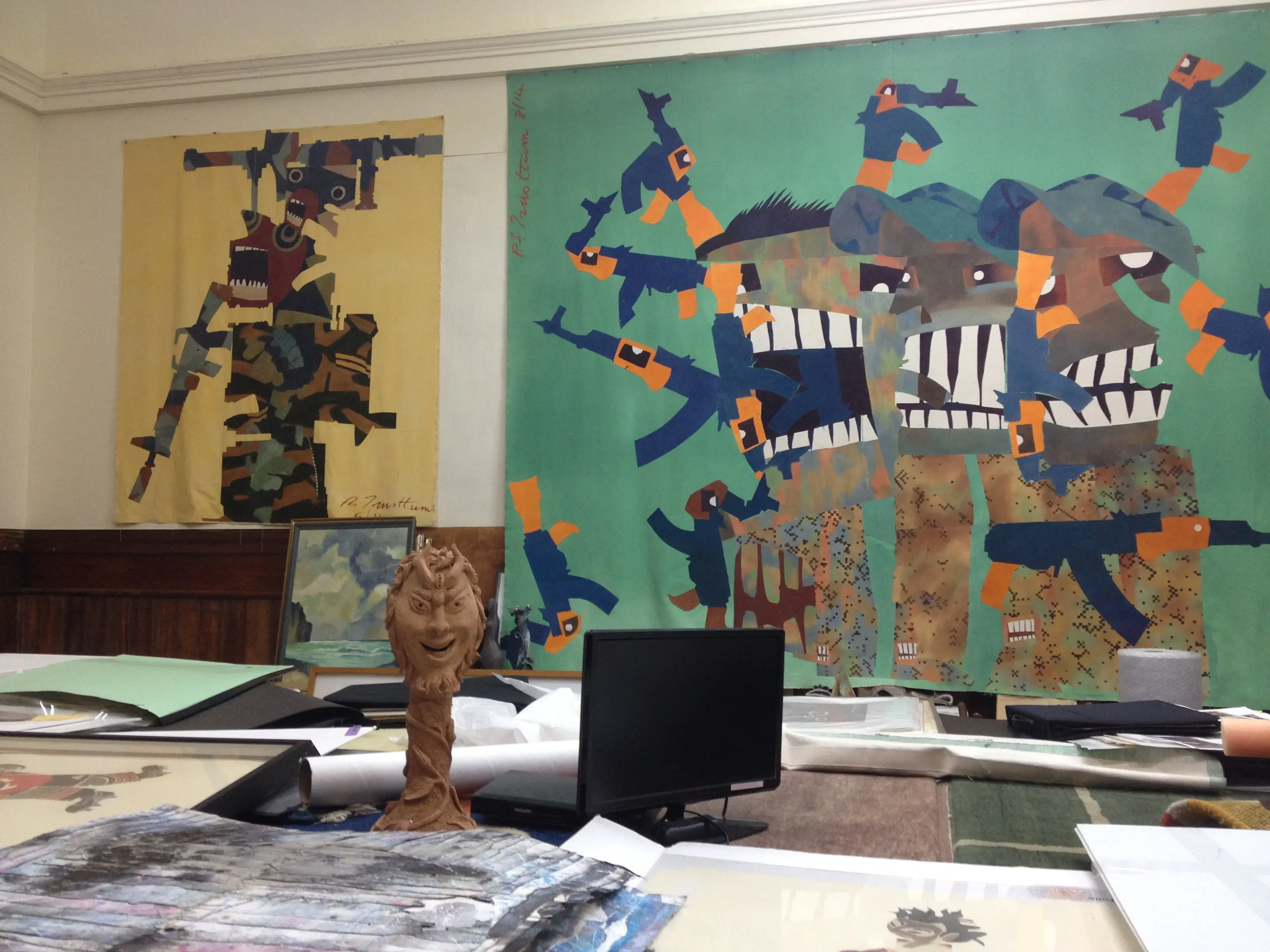 In the large back room Don Drivers are draped over stacks of works, while other multifarious smaller works by well-known (but perhaps out of vogue) artists peek out of available wall and lean-to space. The main wall space and an enormous central set of drawers however are set aside for the storage of the large loose expressionistic canvases of Christchurch’s Philip Trusttum: more than 300 paintings and 500 drawings in all. Currently on the walls are Trusttum’s giant colourful, savage yet comical figurative takes on ISIS fighters. Positive and negative space silhouettes fight it out in camouflage pattern, with giant sharpened teeth and palisades of rifles - a gorgeous, gruesome carnival.