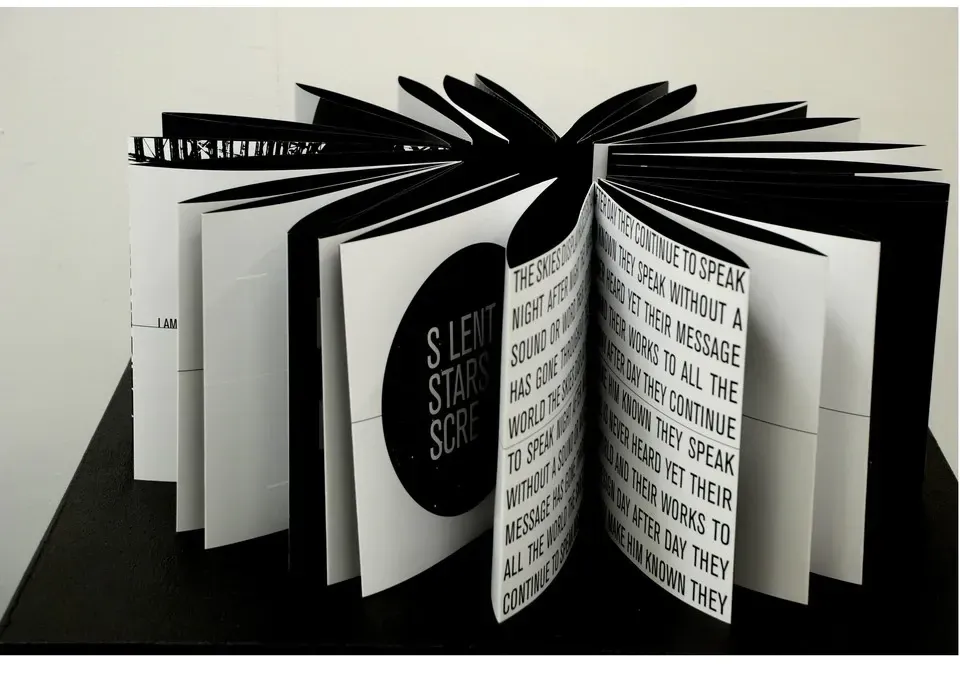 Sam created Define the line while a student at UCOL. The work is a ten metre fold out publication and interactive installation. He says the work is “a personal journey to discover what defines me. It gave a small window into my thoughts, questions and findings that I had discovered. I expressed my findings graphically using the results of minimalist typographic experiments.”