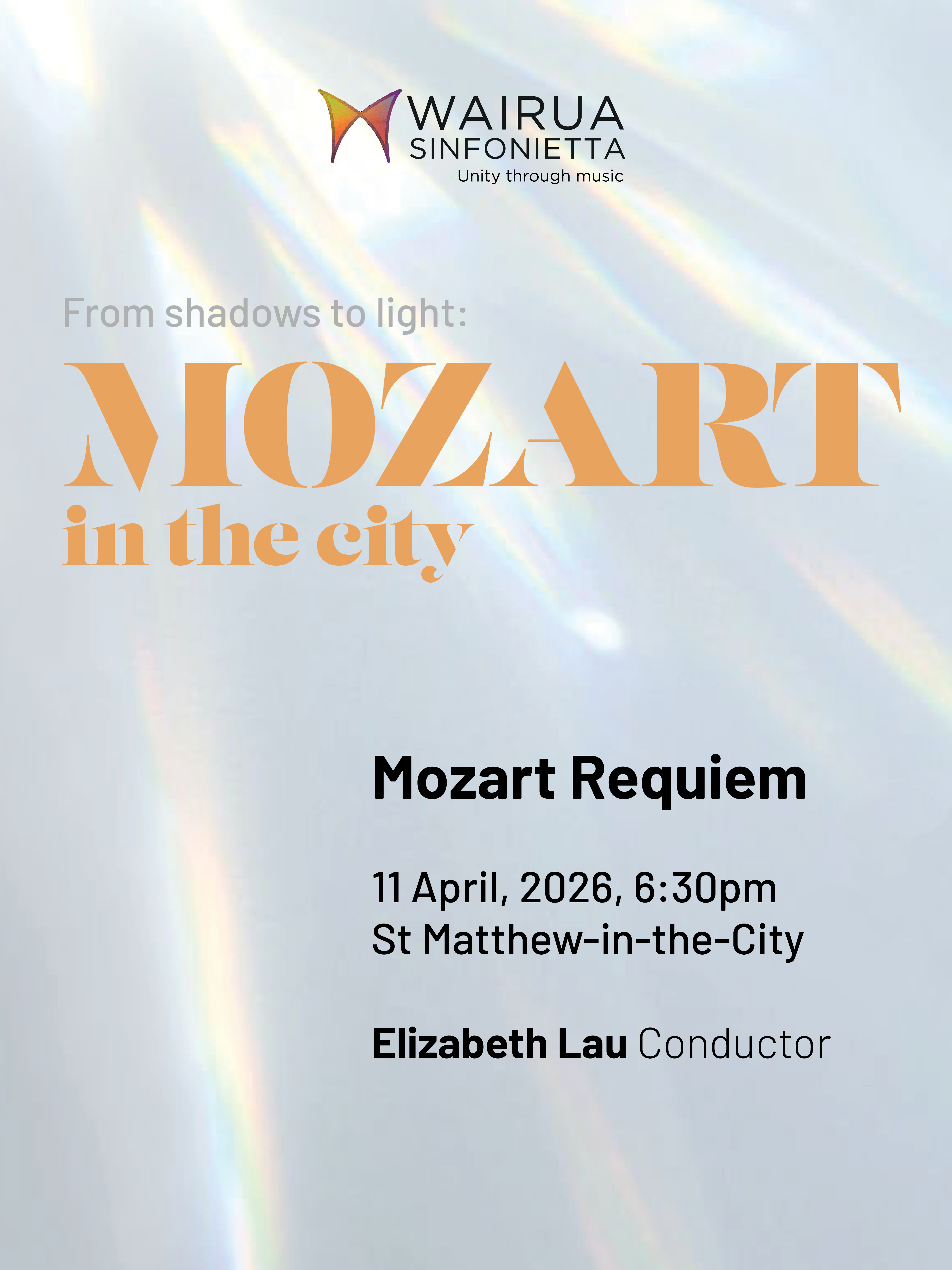 11 Apr, 2026Wairua Sinfonietta Presents - From Shadows to Light: Mozart in the City