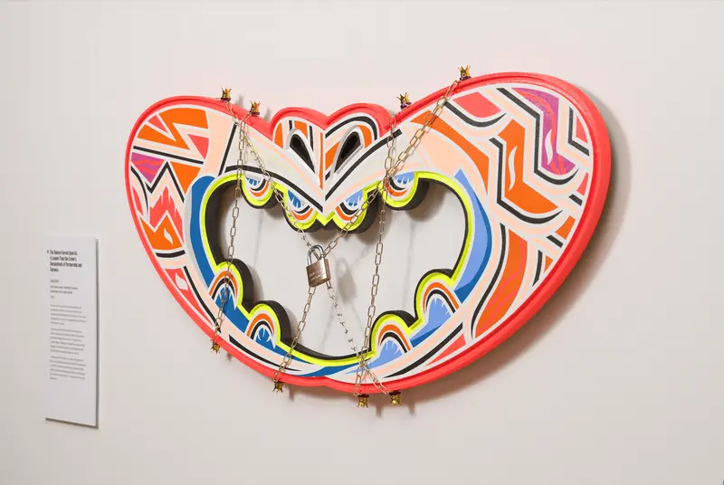 Elliott (Ngāti Awa, Ngāi Te Rangi, Te Whānau ā Apānui, Ngāti Rangitihi) explains the significance of the winning piece, made with acrylic paint on raakau (wood) then bound in chains.