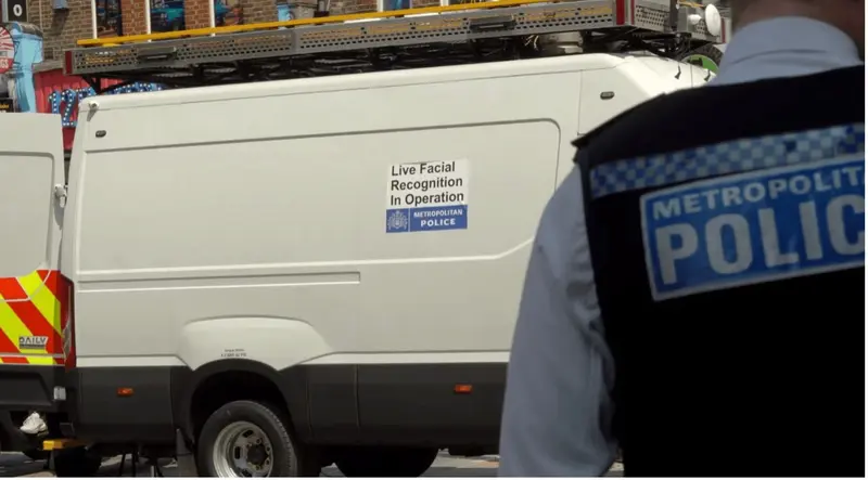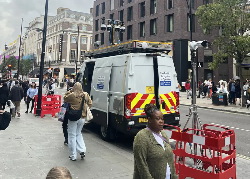 Outside, officers stand beside each barricade, and as I look around Oxford St, I see a couple more roaming within earshot. There’s signage on the side and back of the vehicle; set in small, nondescript sans serif; “Live Facial Recognition In Operation” and underneath, the blue and white logo of London Metropolitan Police.