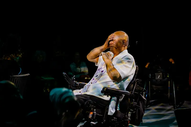 The surrounding actors also play a version of Pati, imbuing him with their own qualities. The cast consists of Mere Boynton, Paris Tuimaseve-Fox, Lavinia Lovo, Albert Latailakepa, and Faith Tou; accompanied onstage by a talented band of musicians. Meka Nehemia on percussion, Hayden Nickel on violin, Andy Mauafua on guitar, and Isitolo Alesana on bass each move amongst the cast and contribute to the performance physically as well as musically. Live arts in Aotearoa aren’t foreign to wheelchair users, with dancer and wheelchair user Rodney Bell being recognized with critical acclaim both nationally and internationally for his choreography. It's no different in Music Portrait of a Humble Disabled Samoan, as wheelchair users Lavinia Lovo and Faith Tou steal the show for me. As a lover of physical theatre, seeing these actors performing highly choreographed work is an absolute pleasure. The most compelling moment for me involves elements of physiotherapy incorporated into the choreography as Pati journeys through his physical rehabilitation. I hope Music Portrait of a Humble Disabled Samoan is the first of many high production value shows that not only integrate, but spotlight disabled actors.