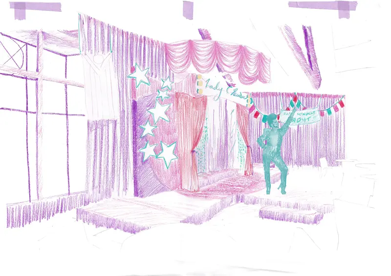 When approached to design for D.R.A.G (Dressing Ressembling a God) by Daniel Williams, director and creator of the show, I thought back on my experiences working with archives in my early 20s. The “set” is an assemblage of traces of venues held within Kawe Mahara Queer Archives Aotearoa, in the backgrounds of Clark’s book Go Girls, and the public access documentary about Darcelle XV, who was until very recently the United States longest living drag queen who performed until her passing at 93. The past is present – built up in deliberate layers of queer aesthetics like the chic-nana core of Carmen’s, the DIY 70s glam of Mojos, and the recent infiltration of LEDs you might see in Caluzzi or Ivy Bar. Eras are stacked on top of one another, imaging a space that has survived through violent policing, legal reform, and gentrification.