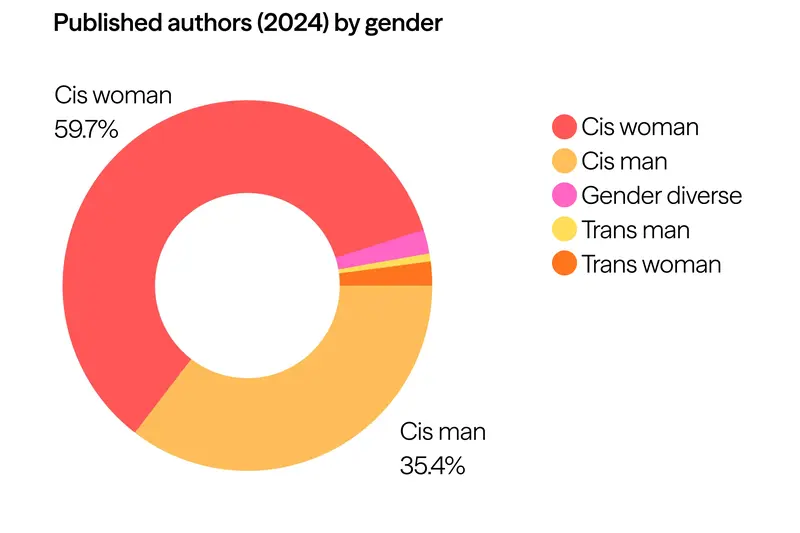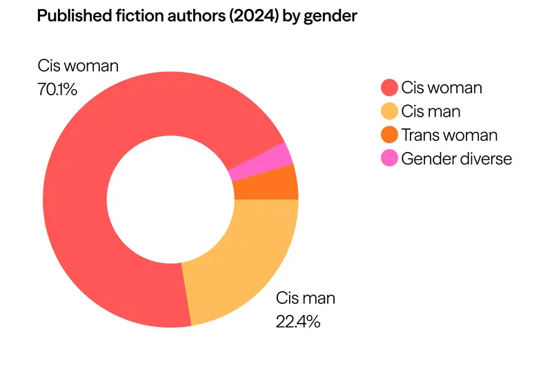 The fiction data, tracking 69 titles by 66 authors, has barely changed since 2023. Small changes trend toward more authors and better representation for minority groups. Notably, in the gender breakdown, 2024 saw three trans women publish fiction titles, as well as two gender diverse writers. Cisgender women still dominate in this space, though they shifted slightly from 74% in 2023 to 70% of published works in 2024. Cisgender men are the next biggest category at 22%, down slightly on 2023, when they held 24%.