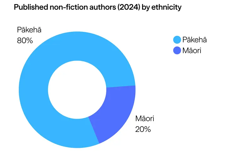 Only Pākehā and Māori authors were recorded in the category in 2024. The number and percentage of Māori writers rose compared to 2023, but we lost a Pasifika presence. Pākehā maintained their 80% share of the titles authored.