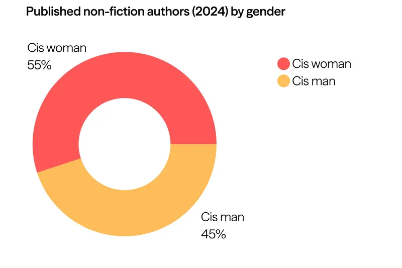 The non-fiction area is where the most significant shift can be observed, though this category has fewer titles, 20 by 20 authors, so small changes can affect the data acutely. In 2023, cisgender men held the largest percentage of titles at 60%, while cisgender women held 33% – it was the only category where men held the highest percentage. In 2024, this position was handed over to cisgender women, now holding 55% of titles and cisgender men only 45%.