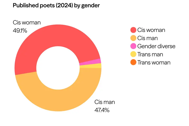 There are positive shifts, however. Māori published more titles in 2024 than in 2023. Four trans and three gender diverse writers were published in 2024. In the poets, we saw an almost Census-accurate split of gender and ethnicity.